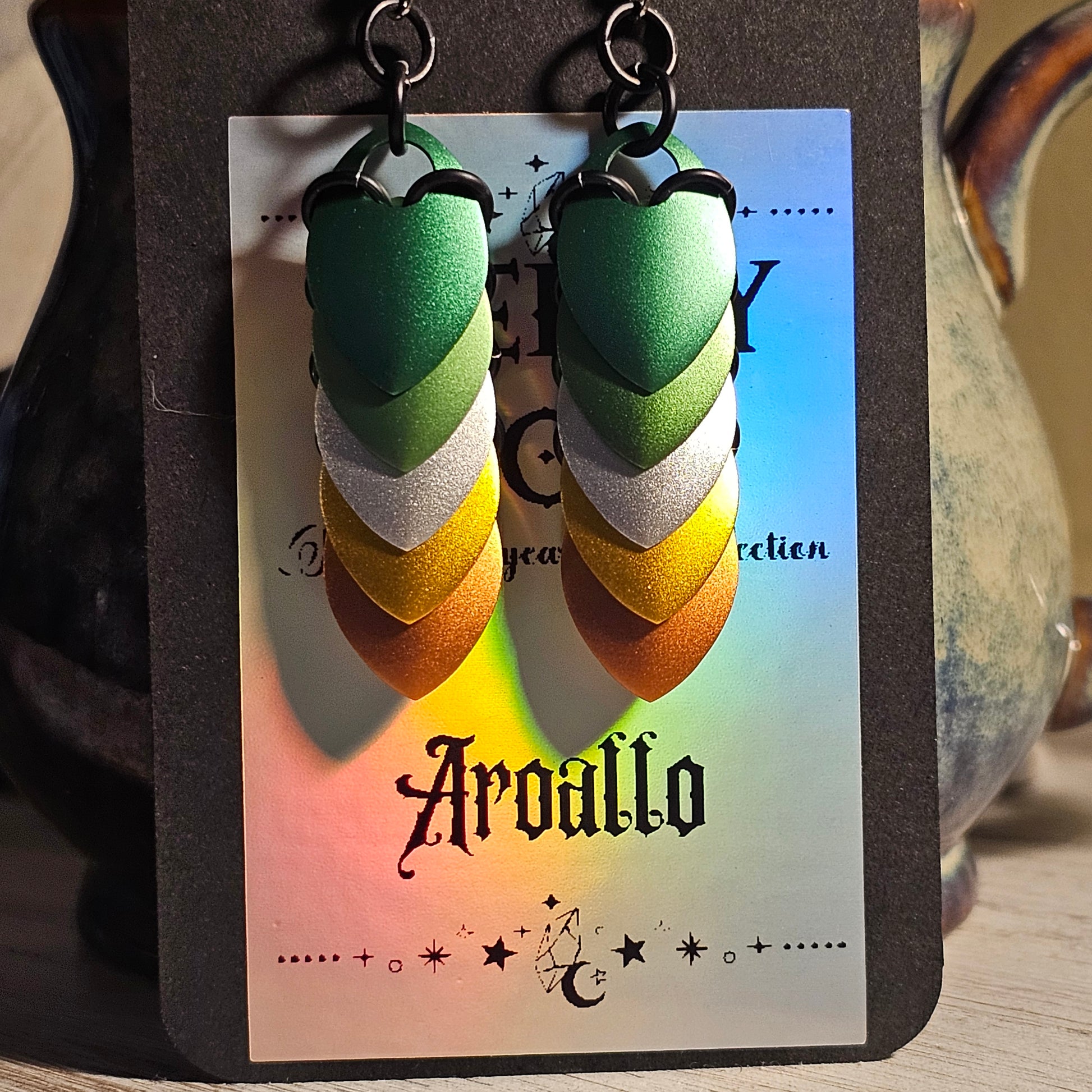 Made with high quality anodized aluminum scales and rings hanging from stainless steel ear wires.